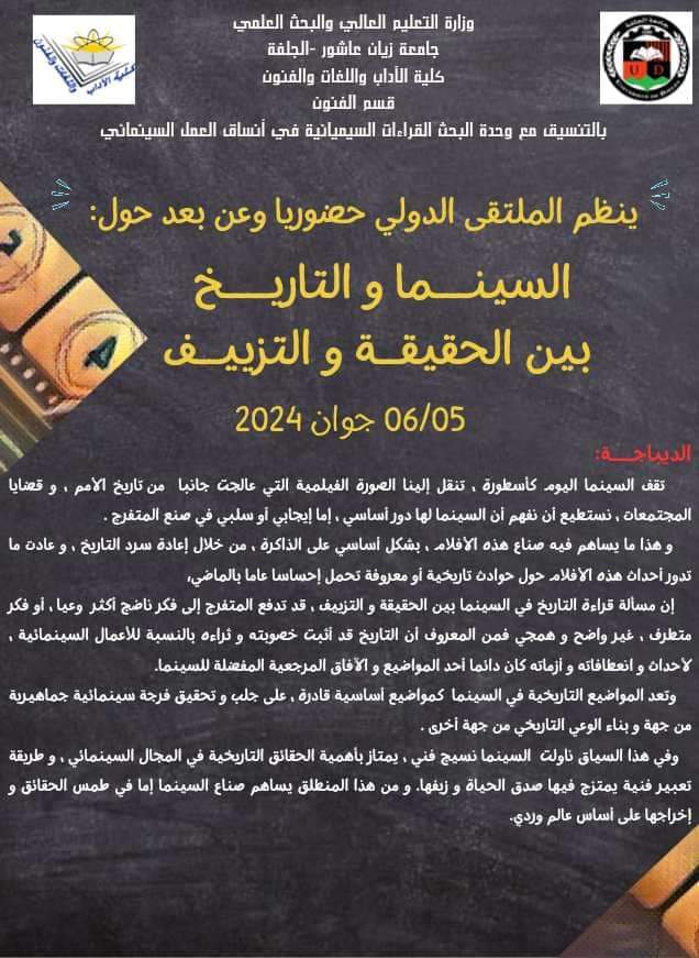 الملتقى الدولى الأول حول السينما و التاريخ بين الحقيقة و التزييف حضوري/عن بعد