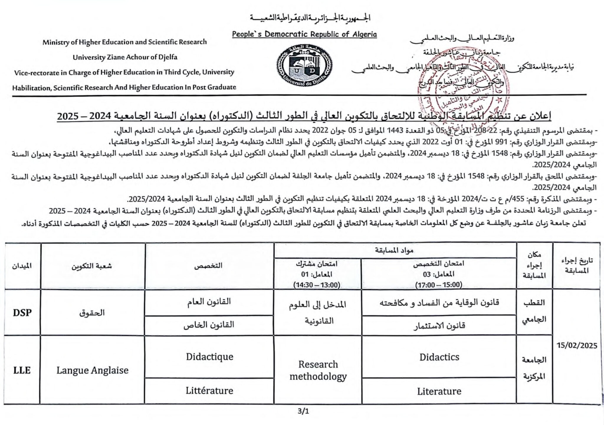 Announcement of the organization of the national competition for admission to higher education at the third level (PhD) for the academic year 2025/2024 and the locations of the exams