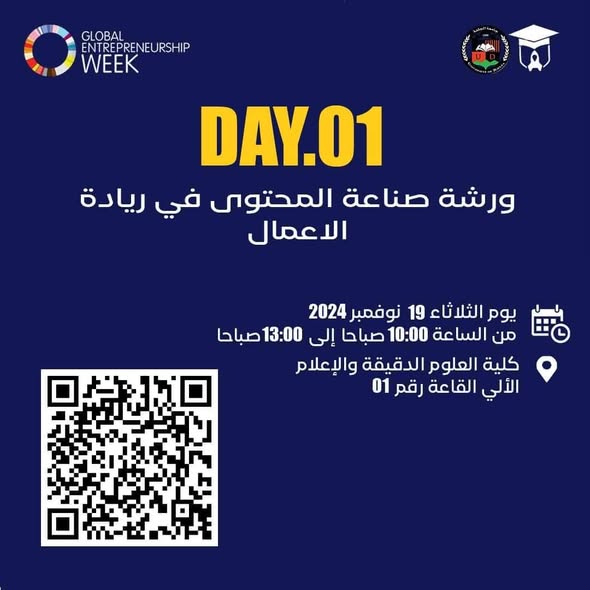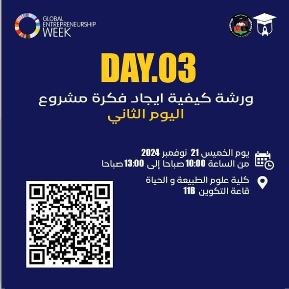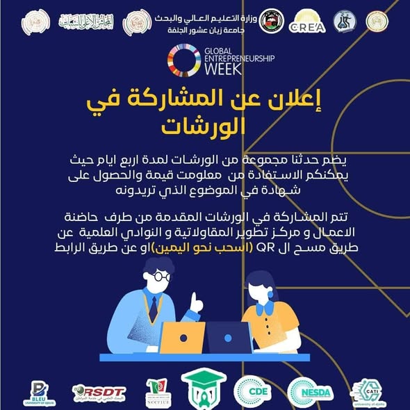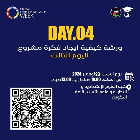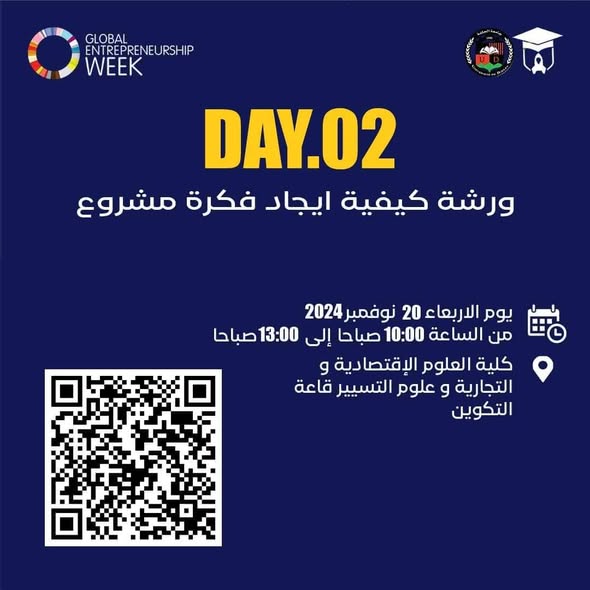 في اطار فعاليات الأسبوع العالمي للمقاولاتية من 18 نوفمبر إلى 24 نوفمبر 2024 تتشرف ادارة حاضنة الاعمال ومركز تطوير المقاولاتية بالاعلان عن الورشات التكوينية في ريادة الاعمال
