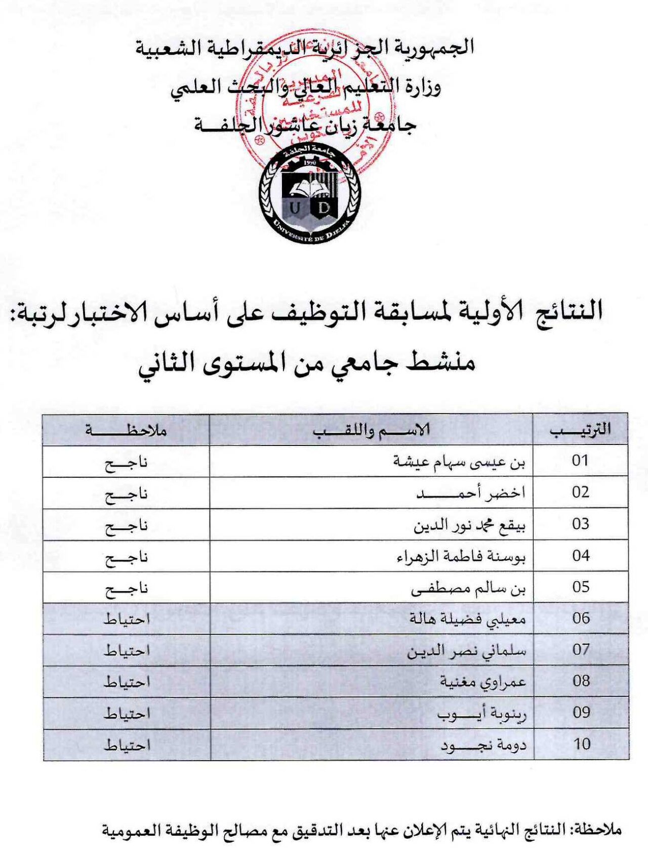 النتائج الاولية لمسابقة التوظيف على أساس الاختبار لرتبة منشط جامعي من المستوى الثاني