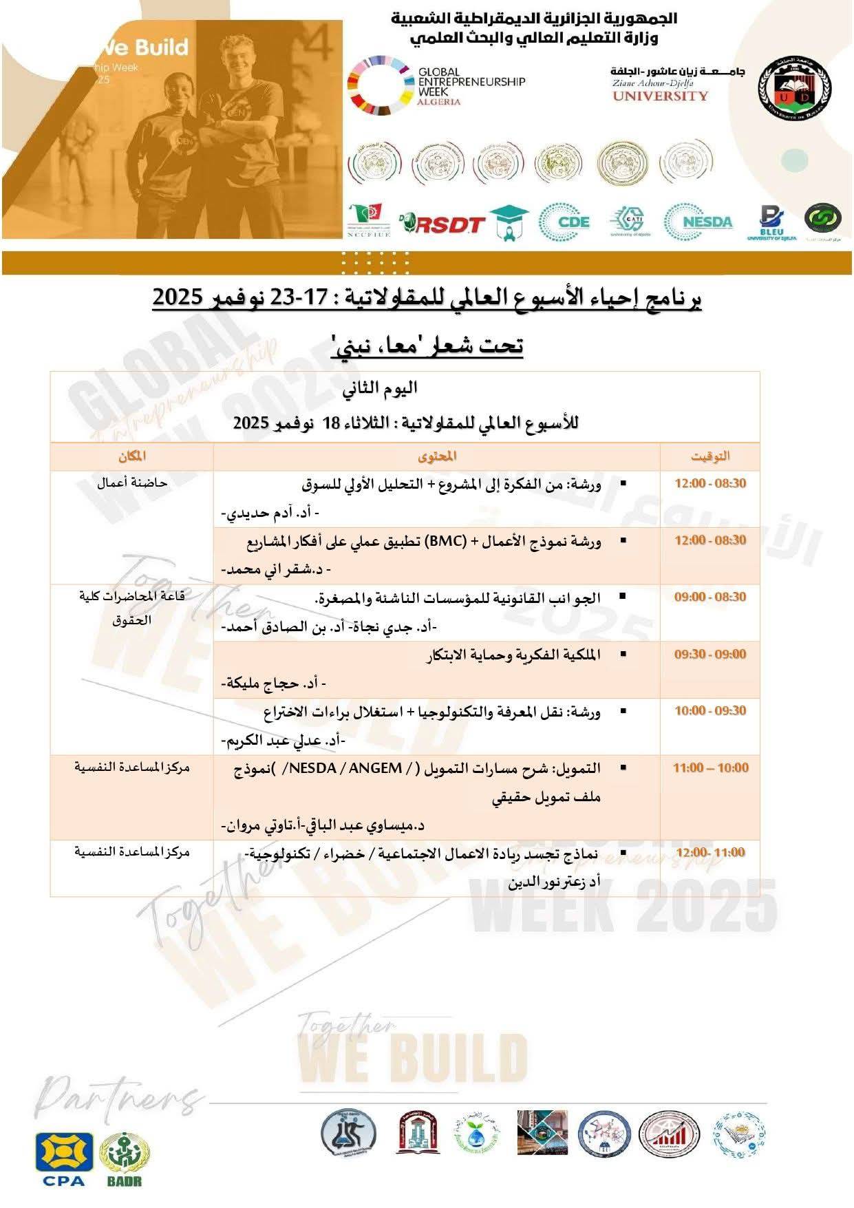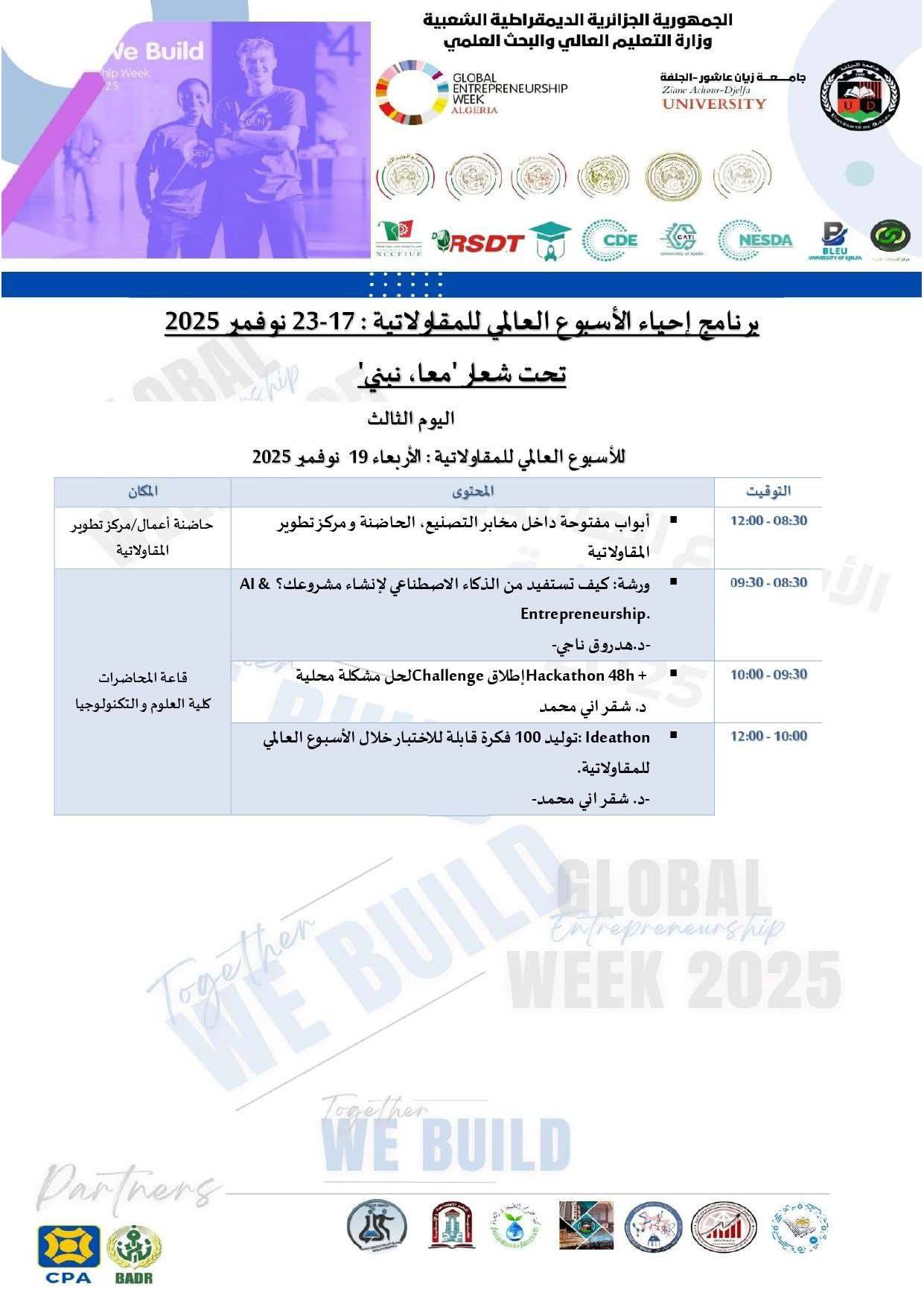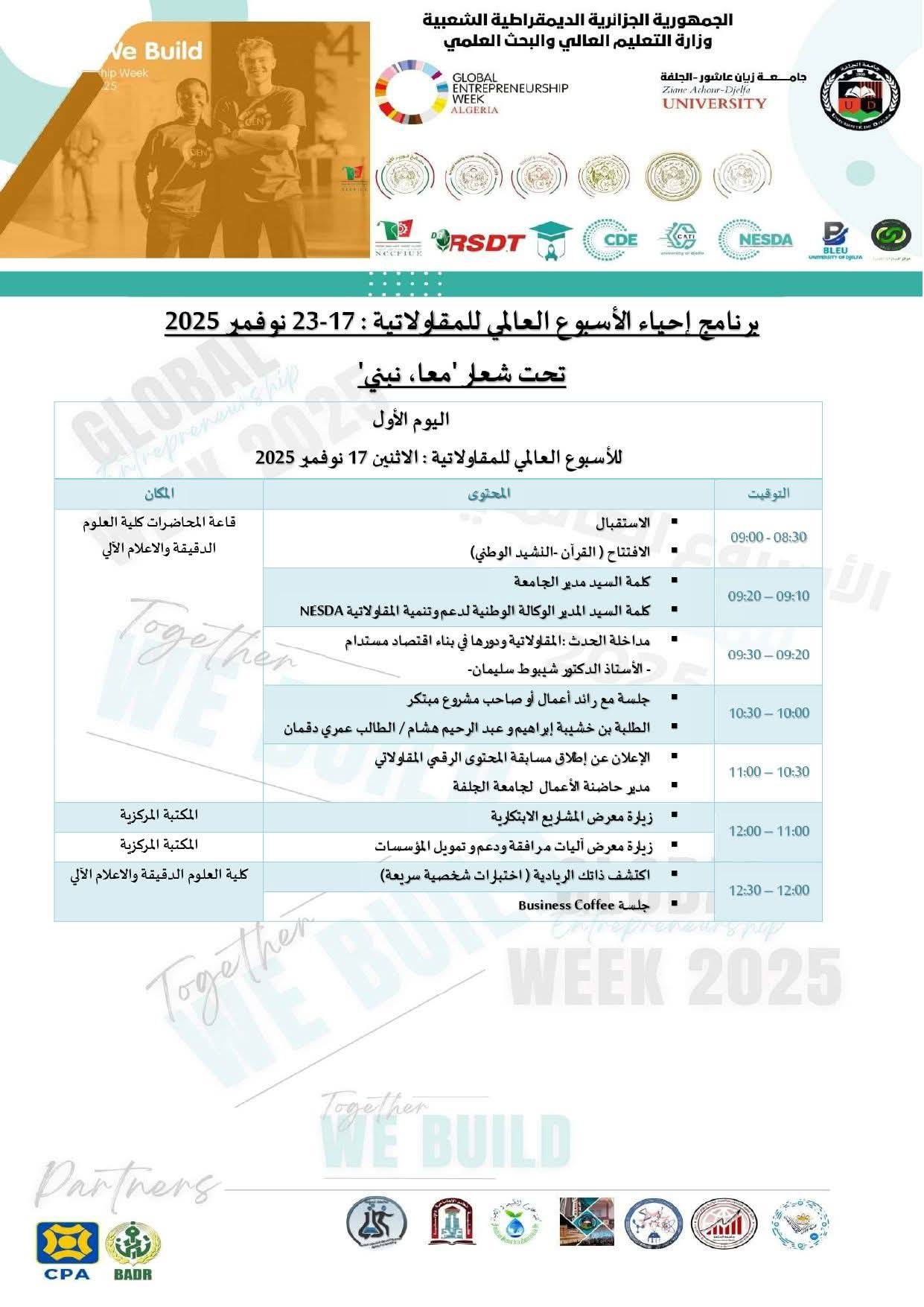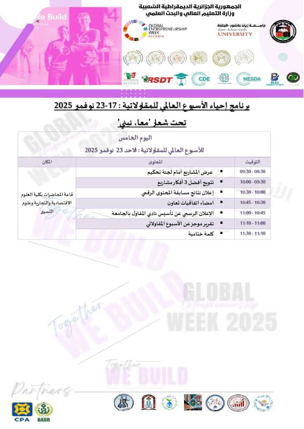 إنطلاق الأسبوع العالمي للمقاولاتية 2025 بجامعة زيان عاشور بالجلفة تحت شعار “نَبْنِي” ، افتتحت جامعة زيان عاشور اليوم فعاليات الأسبوع العالمي للمقاولاتية 2025، وهو الحدث الأبرز لدعم الابتكار وريادة الأعمال، حيث اشتملت على مجموعة من النشاطات، مداخلات، و ورشات ومعرض للمشاريع المبتكرة، وآليات الدعم والتمويل و المرافقة، و مسابقات، بحضور ممثلي الشركاء وهيئات الدعم والتمويل و المرافقة.