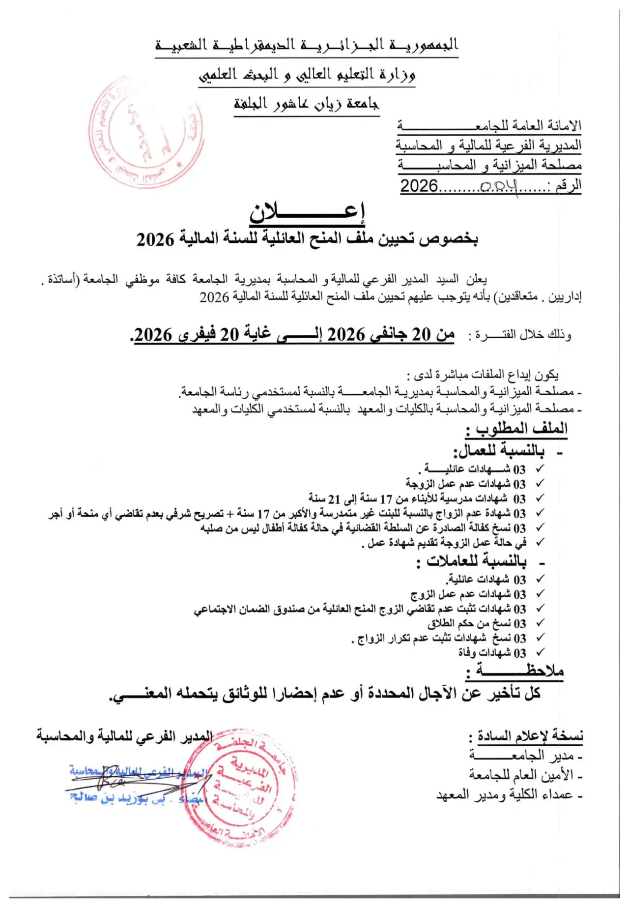 إعلان بخصوص تحيين ملف المنح العائلية للسنة المالية 2026