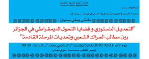 ملتقى وطني :التعديل الدستوري و قضايا التحول الديمقراطي في الجزائربين مطالب الحراك الشعبي و تحديات المرحلة القادمة 2020-02-05